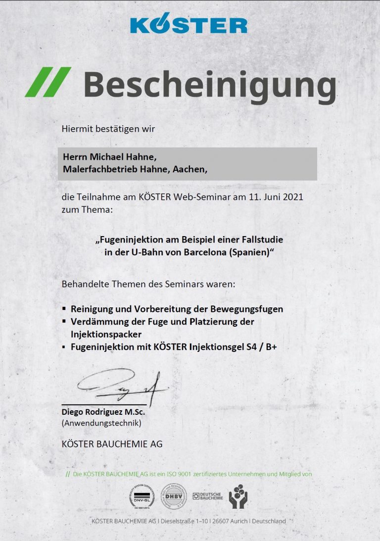Teilnahme am KÖSTER Web-Seminar zum Thema „KÖSTER NB 1 grau – Tipps und Tricks“ mit Fokus auf Dichtungsschlämme, Materialanwendung und typischen Verarbeitungsfehlern am 16. April 2021.